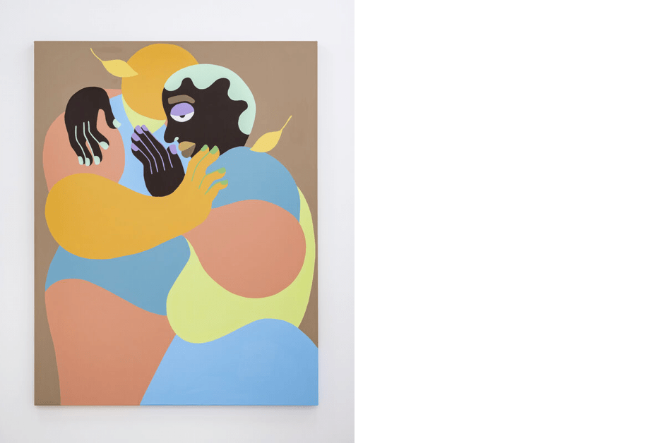 Segun has solidified her style through a carefully constructed vibrant pastel pallet to communicate restful intimate portraits. Her large-scale canvases summon the viewer to follow the curvatures of the figures, where their calming features and heavy eyelids create a sense of peace. Despite the sort of cubist abstraction that she harnesses, the considered colour scheme makes such bold tones feel overwhelmingly serene.